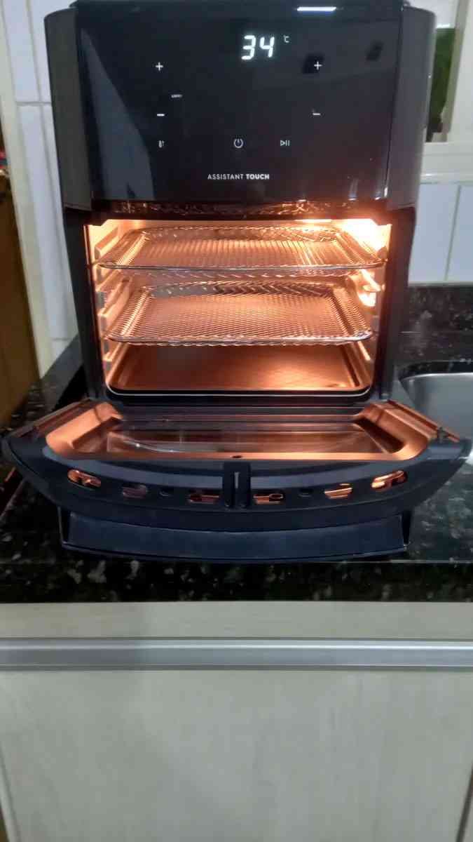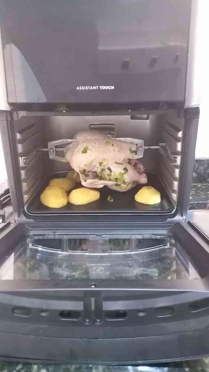 Em um cenário que sintetiza os relatos dos compradores: domingo à noite, frango de 1,1–1,2 kg no espeto rotisserie. Pré-aquecer acionado; metade do tempo, o alerta “virar” aparece (útil para outros preparos). Resultado: dourado por igual e suculento, com limpeza prática graças à bandeja coletora.